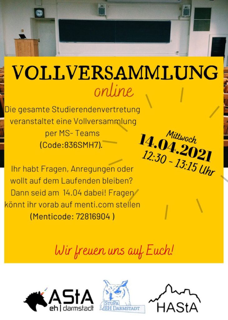 Am kommenden Mittwoch, am 14.04.2021, von 12:30 bis 13:15 veranstalten wir wieder eine Vollversammlung über MS Teams (Code, um dem Team beizutreten: 826smh7 / Link zum Teambeitritt: