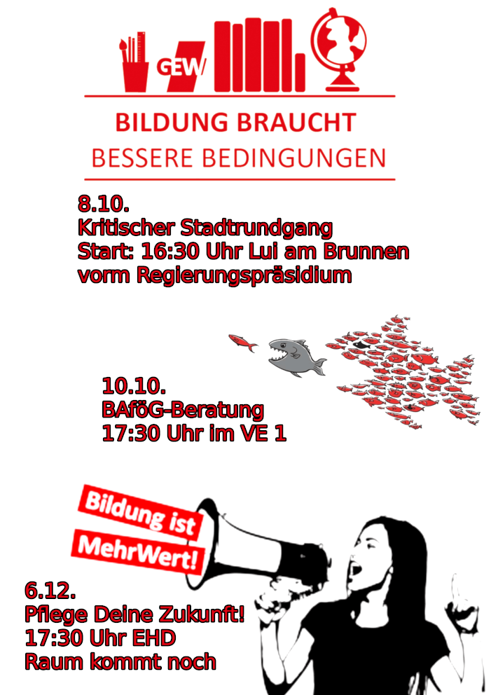 Themen sind dieses mal: Kritischer Stadtrundgang, BAföG-Beratung und Pflege Deine Zukunft!