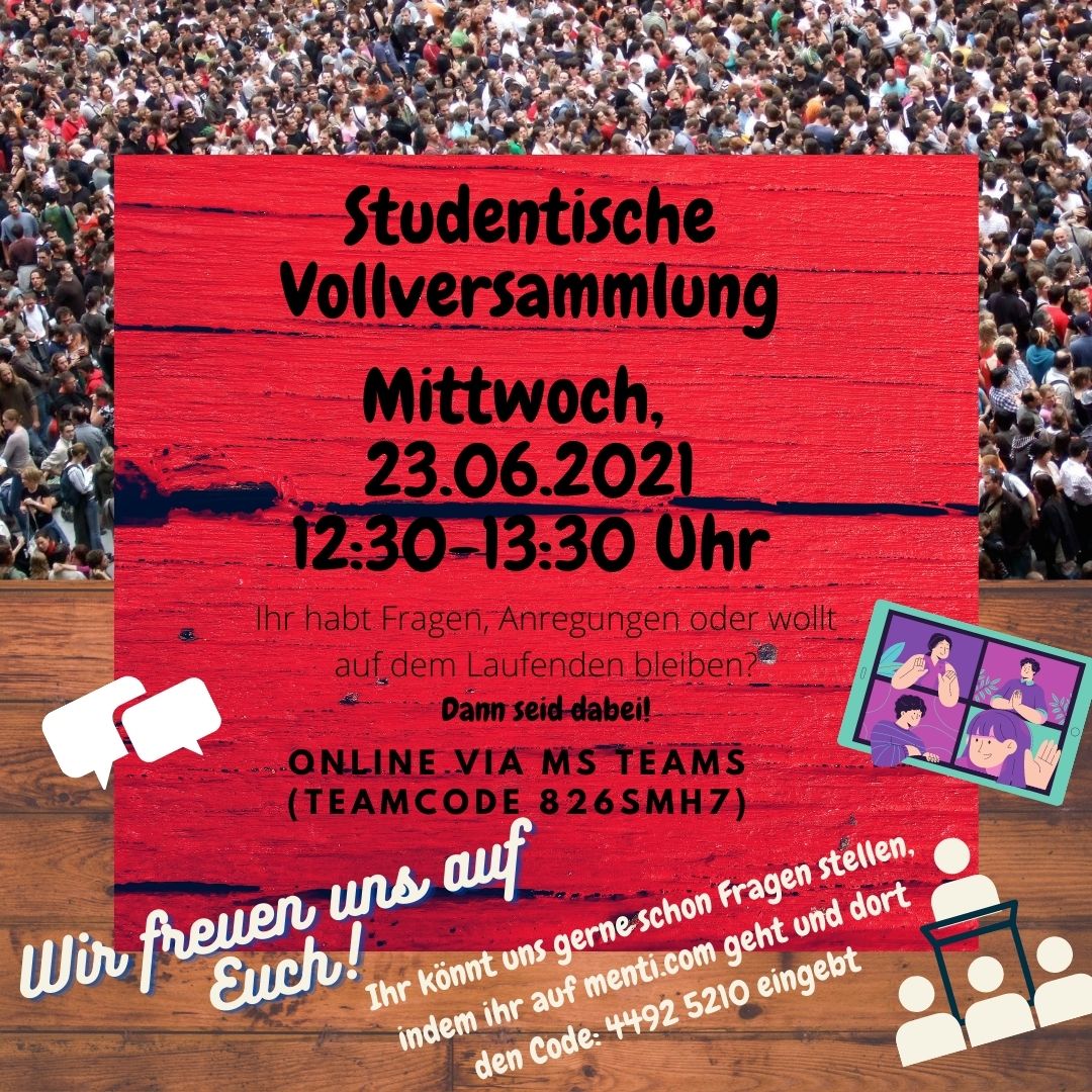 Hallo liebe Studis, an diesem Mittwoch, den 26.01.2022, von 12:30 bis 13:30 veranstalten wir wieder eine Vollversammlung über MS Teams (Code, um dem Team beizutreten: 826smh7) Link zum Teambeitritt: https://teams.microsoft.com/l/team/19%3a58d4b057f1004d6c8e7729c0f6d0508e%40thread.tacv2/conversations?groupId=9a151e73-5254-4398-b1d3-180d3465b9ce&tenantId=0e51ed02-aed0-4c96-a945-5a98ca97e636. Die vorläufigen Tagesordnungspunkte werden sein: Gremienvorstellung […]